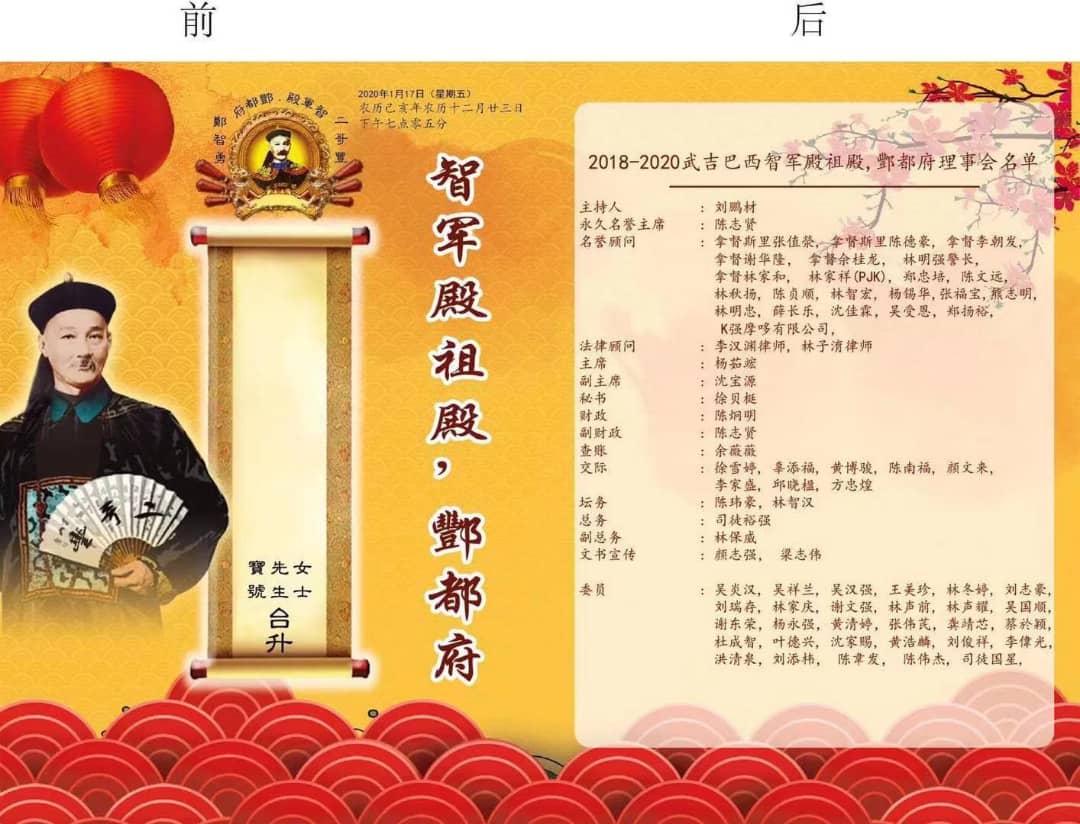 各位亲爱的朋友们,智军殿祖殿、酆都府在2020年1月17日(农历12月23)星期五,晚上7点05分,麻坡新加旺,新奇珍宴会厅(A厅),